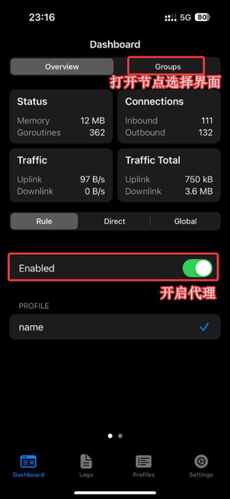 选择 一键导入 SingBox 订阅 ,系统会自动将您重定向到 SingBox 客户端,选择import确认,软件将会自动下载并应用订阅。